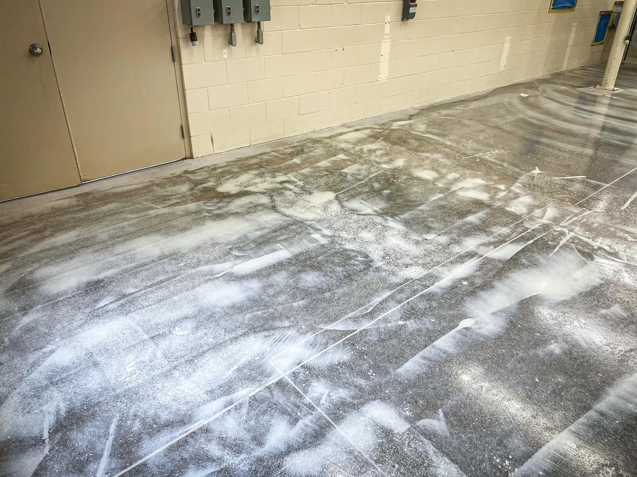 By grinding and sealing, the floor is “cleaned” using our commercial diamond grinding equipment. The grinding removes old coatings, paint, and dirt on the surface. After the initial grind, N.E.W Coatings likes to hone out scratches with 80-120 grit tooling. The grinding prepares the surface for proper adhesion of the coatings, and the preparation is why our coatings last a lifetime.