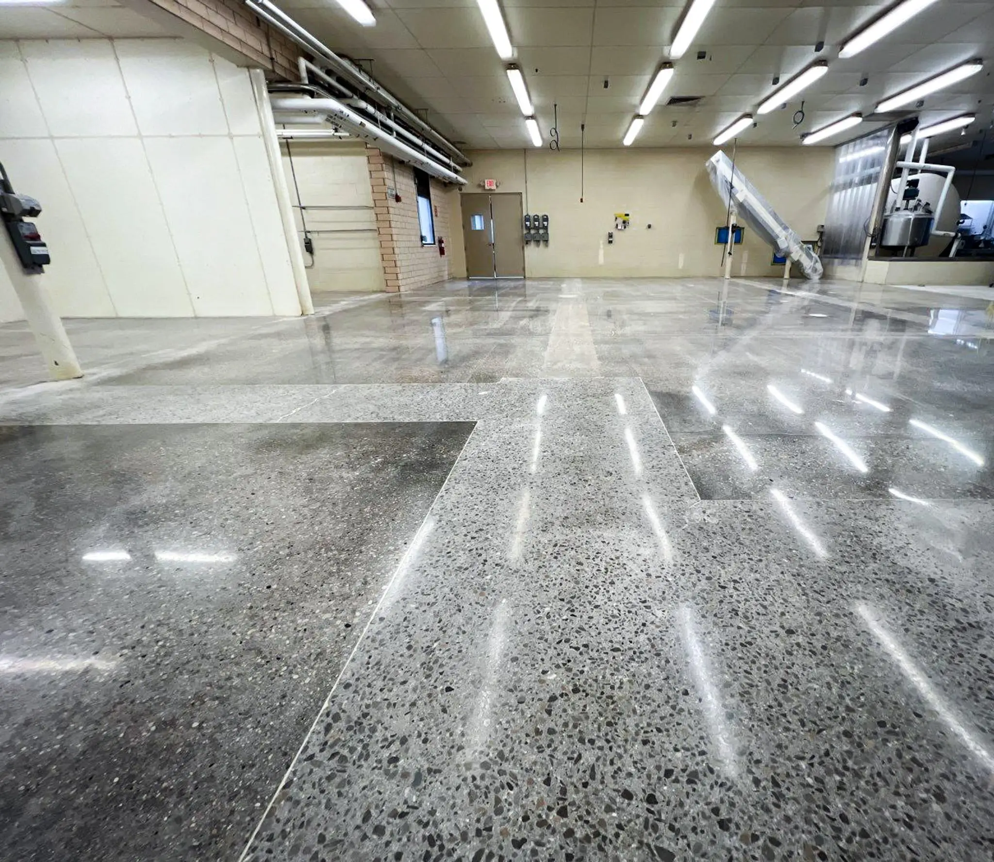 Grinding the concrete also aids in making a very flat and uniform surface. Polished concrete leaves as mid to high gloss, almost mirror like, while grind and seals make a matte, satin, or high gloss finish available depending on the top coat used. To add color to a floor, we use a water based stain that that can range from transparent to opaque. Once the stain is applied, we then lock in the color with a water based epoxy primer and protect the surface with a hi wear urethane. These urethane top coats are great for protecting the surface from a residential spill such as coffee, ketchup, oil or red wine. They also clean great and offer supreme abrasion resistance when it comes to scratching via dragging equipment in a commercial or industrial environment.